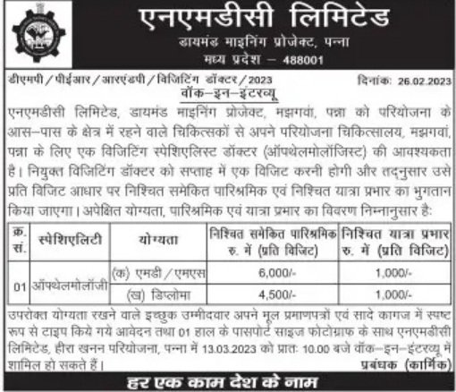 NMDC Limited Recruitment 2023 : राष्ट्रीय खनिज विकास निगम मध्यप्रदेश ने ऑप्थेल्मोलॉजी पद की पूर्ति के लिए निम्न पदों पर भर्ती निकाली हैं। इक्छुक उम्मीदवार दिनांक 26/02/2023 से 13/03/2023 तक ऑफलाइन आवदेन कर सकते हैं।