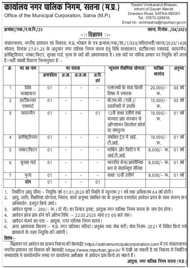 Nagar Palika Satna Recruitment 2023 : नगर पालिका सतना मध्‍यप्रदेश (Nagar Palika Satna Madhya Pradesh) ने भृत्‍य, सुरक्षा गार्ड सहित अन्‍य पदो की पूर्ति के लिए 08 पदों पर भर्ती निकाली हैं। इक्छुक उम्मीदवार दिनांक 26/04/2023 से 22/05/2023 तक ऑॅफलाइन आवदेन कर सकते हैं।